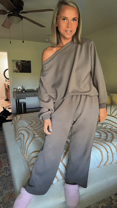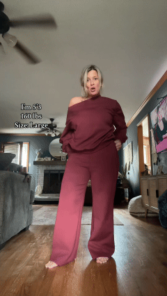 Featuring a stylish sloping off-shoulder top with long sleeves and matching high-waist trousers, it delivers an effortlessly refined look. The smooth texture feels cozy—without that odd cold touch some sweat sets have—keeping you warm while still perfect for autumn wear.